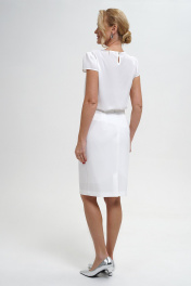 Жакет женский полуприлегающего силуэта, на подкладке, с застёжкой на петлю и пуговицу. Перед с рельефными швами, с прорезными карманами с двумя обтачками. Спинка со средним швом и рельефными швами. Рукава двухшовные, длинные, со шлицей в локтевом шве, декорирована пуговицей. Воротник втачная стойка. Блуза женская полуприлегающего силуэта, (Р46-50 с разрезом ввиде капельки по центру горловины спинки и застёжкой на навесную петлю пуговицу), низ фигурной формы. Перед с нагрудными выточками. Рукава втачные, крылышко по окату со сборкой. Юбка полуприлегающего силуэта, книзу чуть заужена, на подкладке, на поясе (Р52-56 по боковым на резинке), с застёжкой на потайную молнию по среднему шву спинки и петлю, пуговицу по поясу. Переднее полотнище с талевыми выточками. Заднее полотнище с талевыми выточками и щлицей.