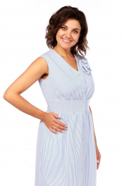 Платье с притачным поясом по линии талии и со сборкой по шву соединения, с застёжкой на петли, пуговицы, чуть спущенное плечо, с карманами в боковых швах и разрезами по низу. Декорировано съёмным украшением.