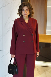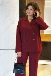 Жакет прямого, свободного силуэта, без подкладки, со спущенной линией плеча, с двух-бортной застёжкой на петли, пуговицы и внутренней застёжкой на петлю, пуговицу. Перед с отложными лацканами. Спинка со средним швом. Рукава втачные, одношовные, длинные (при желании можно отвернуть как цельнокроеная манжета). Воротник отложной с отворотом. Брюки прямого силуэта, со сгибом, на притачном поясе с резинкой по боковым. Застёжка типа «гульфик» на молнию и петлю, пуговицу по краю пояса. Передние части с имитацией боковых косых карманов. Задние части с талевыми выточками.