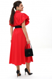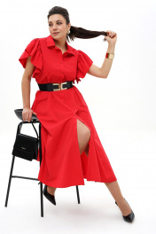 Платье женское полуприлегающего силуэта вверху с расширением книзу, отрезное по линии талии, в дополнении ремень. С застёжкой по притачной планке на петли, пуговицы. С короткими рукавами «крылышко» собраны на сборку. Воротник стояче-отложной на отрезной стойке, застёгивающейся на петлю, пуговицу.