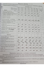 Комплект женский 2-х предметный состоит из жакета и брюк. Жакет прямого, свободного силуэта понизу спинки степень прилегания фиксирует резинка, с центральной застёжкой на петли, пуговицы. Перед с прорезными карманами с листочкой (правая часть декорирована аппликацией из отделочной тесьмы). Рукава цельнокроеные со спинкой переходящие на перед, длиной ¾, понизу с притачными манжетами. Воротник пиджачного типа. Брюки типа «банан», с притачным поясом на резинке. Передние части с косыми боковыми карманами, по центру от низа конструктивная выточка.