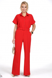 Комбинезон женский отрезной по линии талии, со спущенной линией плеча, со съёмным ремнём продергивающийся через шлёвки по боковым. Лиф переда с застёжкой на петли, пуговицы, по линии талии сборка. Брюки прямого, свободного силуэта, с застёжкой типа «гульфик» на молнию. Передние части с косыми боковыми карманами, задние с талевыми выточками. Воротник стояче отложной на отрезной стойке, застёгивающийся на петлю, пуговицу.