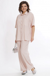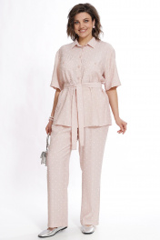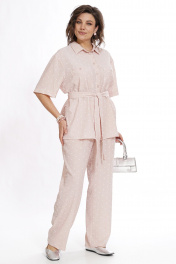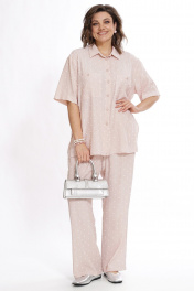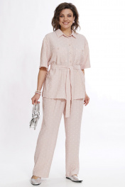 Блузка свободного, прямого силуэта, с застёжкой на петли, пуговицы, с завязывающимся поясом, по боковым разрезы. Перед с нагрудными выточками и накладными нагрудными карманами пристёгивающиеся на петлю, пуговицу. Спинка с притачной кокеткой и мягкой встречной складкой. Рукава втачные, одношовные, короткие. Воротник стояще-отложной на отрезной стойке, застёгивающийся на петлю и пуговицу. Брюки женские широкие, свободные, прямого силуэта, с притачным поясом на резинке. Передние части с косыми боковыми карманами.