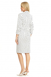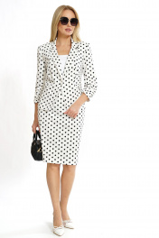 Жакет полуприлегающего силуэта, на подкладке, с отложными лацканами с центральной застёжкой на петлю, пуговицу, по лацкану, краю борта вставлен отделочный кант. Перед с фигурными рельефными швами с прорезными карманами с листочкой. Спинка со средним швом и фигурными рельефными швами. Рукава втачные, двухновные, длиной ¾, понизу со сборкой. Воротник отложной с отворотом. Юбка полуприлегающего силуэта книзу чуть заужена, на подкладке, на притачном поясе, с застёжкой на потайную молнию в среднем шве заднего полотнища и петлю, пуговицу по поясу. Переднее полотнище с талевыми выточками. Заднее полотнище с талевыми выточками и средним швом заканчивающийся шлицей. Топ полуприлегающего силуэта. Горловина формы «карэ».