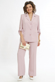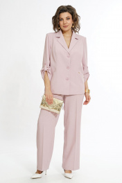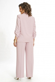 Комплект женский 2-х предметный состоит из жакета и брюк. Жакет прямого силуэта, с застёжкой на петли, пуговицы. Перед с отложными лацканами, рельефными швами переходящие под углом в боковые и карманами расположенными в швах. Рукава втачные, одношовные, длиной ¾ и патами регулируемые длину рукава на петлю, пуговицу. Воротник отложной с отворотом. Декорированный нашивкой по левой стороне переда. Брюки прямого силуэта, со сгибом, с притачным поясом по боковым на резинке, с застёжкой типа «гульфик» на молнию и петли, пуговицы по краю пояса. Передние части с имитацией косых боковых карманов. Задние части с талевыми выточками