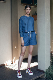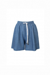 Шорты женские из трикотажного полотна, прямые, на притачном поясе. Пояс с эластичной тесьмой, двумя обметанными петлями, в петли вставлен шнур (из тесьмы), завязывающийся на бант. Передние части шорт с боковыми карманами, обработанными в швах отрезных бочков.