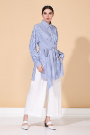 Рубашка с центральной застежкой на петли и пуговицы на планке с декоративной печатью. Перед отрезной по талии с цельнокроеными завязками, спинка с кокеткой, рукава рубашечного покроя со складками по низу на притачных манжетах. Воротник стояче-отложной на отрезной стойке. Низ фигурный с разрезами по боковым швам