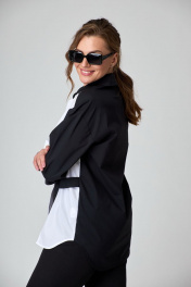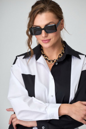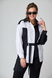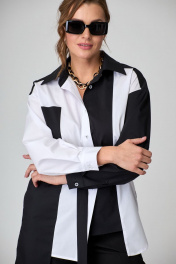 Рубашка женская свободного силуэта с застежкой спереди и стояче-отложным воротником на отрезной стойке, перед с фигурными рельефами и асимметричной линией низа, в области талии на пояске от рельефа до бокового шва, спинка цельная, рукава рубашечного покроя со складками и притачными манжетами по низу. Рубашка выполнена из высококачественного смесового хлопка 2-х цветов