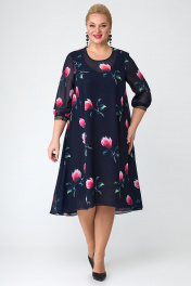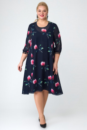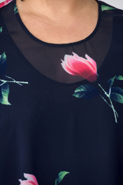 Платье из шифона с ярким цветочным принтом, расширенное, с повышением линии низа по переду. Модель без нагрудной вытачки, что позволяет создать прекрасную посадку на любую фигуру. Спинка со средним швом, вверху каплевидная застежка на пуговице. Рукава втачные, чуть ниже локтя, на эластичной кружевной тесьме. Платье на трикотажной подкладке. Очаровательная модель на все случаи. Длина изделия - по спинке-112 см Длина рукава - 45