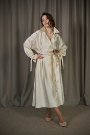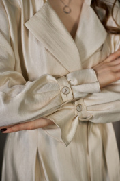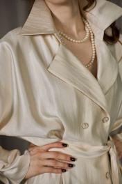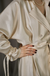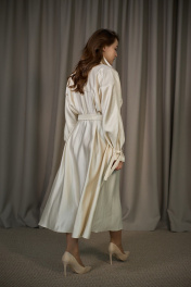Платье нарядное полуприлегающего силуэта из плательной, переливающейся ткани, длиной миди, с цельнокроенным длинным рукавом, отрезное по линии талии. Лиф и юбка переда и спинки со встречными складками-защипами. Лиф спинки со средним швом. В боковых швах имеются функциональные карманы и шлёвки под пояс. Юбка платья слегка А-силуэта. Застёжка на петли и пуговицы спереди фронтальная, двубортная с одним рядом пуговиц. Воротник отложной на отрезной стойке. По рукаву на уровне запястья настрочены шлёвки для заправки и фиксирования паты с застёжкой или же декоративной завязки на выбор, И паты, и завязки рукава имеются в комплекте с изделием, а таже съёмный пояс из основной ткани.