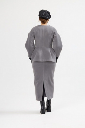 Жакет женский приталенный, двубортный, отрезной по линии талии, из костюмно-пальтовой смесовой ткани, длиной до линии бёдер. Верхняя часть переда с рельефами, верхняя часть спинки с рельефами и средним швом. Нижняя часть переда и спинки-баска с вытачками. Рукав спущенный укороченный, с вытачками снизу, создающими объёмность. Вырез горловины V-образный. В шве талии обработаны потайные обтачные петли. Жакет на поливискозной подкладке.
