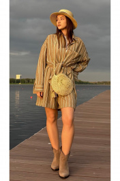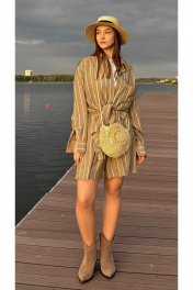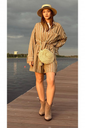 Комплект женский двупредметный из лёгкой плательно-блузочной смесовой ткани в полоску с креш-эффектом, состоящий из блузки и шорт. Блузка рубашечного кроя-over, длиной ниже линии бёдер, со спущенной линией плеча и длинным рукавом. Рукав на притачном манжете с застёжкой на петли-пуговицы. Перед с центральной застёжкой на кокосовые пуговицы, с нагрудными карманами и цельнокроенными планками. Спинка с двойной кокеткой, цельнокроенной с кокеткой переда. В шве кокетки спинки имеется складка. В боковых швах длинные разрезы от талии. Низ прямой. Шорты свободного кроя, длиной выше колена, на притачном широком поясе с резинкой и отстрочкой по ней, с боковыми функциональными карманами с отрезным бочком ("карманы-хулиганы"), с иммитацией застёжки спереди и декоративными кокосовыми пуговицами по ней.