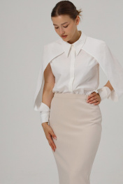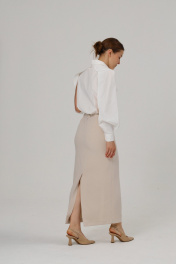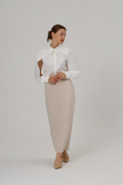 Юбка прямая из костюмной поливискозной ткани, чуть зауженная к низу, длиной миди. Заднее полотнище с талиевыми вытачками, средним швом и шлицей в шве. Юбка на притачном поясе и на подкладке. Для удобства приталивания в пояс по бокам вставлена частично резинка. Пояс застёгивается на петлю и пуговицу.