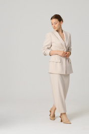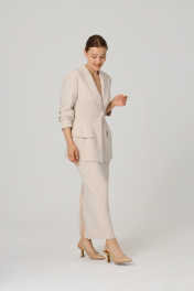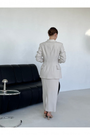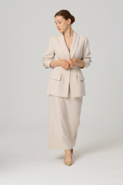 Костюм женский двупредметный из костюмной поливискозной ткани, состоящий из жакета и юбки. Жакет однобортный, приталённого силуэта, длиной ниже линии бёдер. Перед с фронтальной застёжкой на петлю-пуговицу, талиевыми вытачками и фигурным рельефом, переходящим в декоративный фигурный клапан переда и спинки чуть ниже линии талии, подчёркивающий силуэтность. Спинка со средним швом, талиевыми вытачками и фигурным рельефом, переходящим в тот самый фигурный клапан. Воротник шалевый. Рукав длинный втачной двушовный с чуть акцентным плечом. Жакет на поливискозной подкладке. Юбка прямая, чуть зауженная к низу, длиной миди. Заднее полотнище с талиевыми вытачками, средним швом и шлицей в шве. Юбка на притачном поясе и на подкладке. Для удобства приталивания в пояс по бокам вставлена частично резинка. Пояс застёгивается на петлю и пуговицу.
