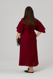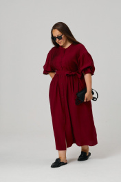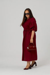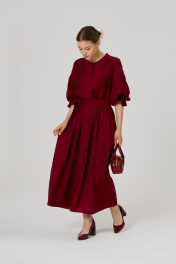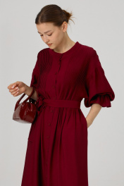 Платье женское, свободного кроя из лёгкой плательной ткани, длиной миди. Перед с декоративными отстроченными продольными складочками-защипами и цельнокроённой планкой с центральной застёжкой на петли и пуговицы. Плечо спущенное, рукав объёмный, длиной 7/8 с резиночкой, создающей эффект валанчика и позволяющей создать изящный рукав 3/4.В боковых швах имеються функциональные карманы. Вырез горловины круглый с втачной стойкой-воротником. Платье со съёмным поясом из основной ткани.