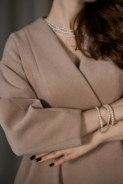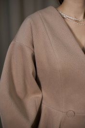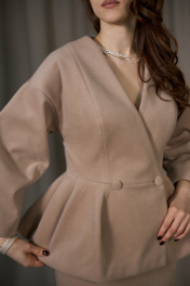 Жакет женский приталенный, двубортный, отрезной по линии талии, из костюмно-пальтовой смесовой ткани, длиной до линии бёдер. Верхняя часть переда с рельефами, верхняя часть спинки с рельефами и средним швом. Нижняя часть переда и спинки-баска с вытачками. Рукав спущенный укороченный, с вытачками снизу, создающими объёмность. Вырез горловины V-образный. В шве талии обработаны потайные обтачные петли. Жакет на поливискозной подкладке.