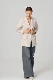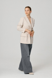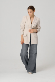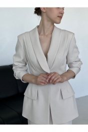 Жакет женский однобортный, из костюмной поливискозной ткани, приталённого силуэта, длиной ниже линии бёдер. Перед с фронтальной застёжкой на петлю-пуговицу, талиевыми вытачками и фигурным рельефом, переходящим в декоративный фигурный клапан переда и спинки чуть ниже линии талии, подчёркивающий силуэтность. Спинка со средним швом, талиевыми вытачками и фигурным рельефом, переходящим в тот самый фигурный клапан. Воротник шалевый. Рукав длинный втачной двушовный с чуть акцентным плечом. Жакет на поливискозной подкладке.