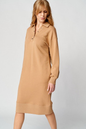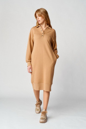 Ультрамодное платье прямого силуэта в спортивном стиле, выполнено из высококачественного трикотажного полотна. Платье со спущенным плечом, длинным втачным рукавом на манжете. Спинка прямая цельная. Перёд прямой, с функциональными карманами в боковых швах. Платье с воротником и V-образным вырезом на притачной планке, декорированной клёпками. По низу платья притачная планка. Воротник, манжеты и планка, по низу платья, из отделочного полотна в рубчик "кашкорсе". Длина платья по спинке: 112 см Длина рукава от горловины: 72 Длина рукава от проймы: 48 см