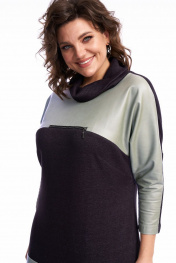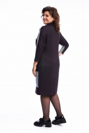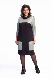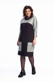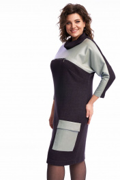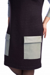Платье женское, полуприлегающего силуэта, чуть зауженное к низу. По переду расположены нагрудные вытачки. В качестве декора используется по переду платья кокетка из экокожи, переходящая в переднюю часть рукава, накладные карманы с притачным клапаном. Также по центру в шве притачивания кокетки расположена имитация кармана в шве на металлическую тесьму-молнию. По спинке линия плеча спущена, рукав втачной. Воротник – высокая стойка, которая неплотно прилегает к шее. Платье выполнено из трикотажного полотна, очень мягкое, удобное, не сковывает движения, может подойти, как для повседневной носки, прогулок, так и для работы в офисе и школах. Длина платья по спинке 100 см, длина рукава от горловины 56 см