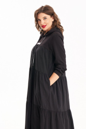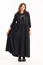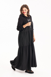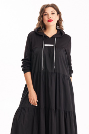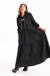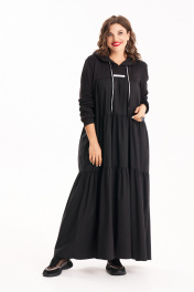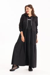 Молодежное платье свободного силуэта, выполнено из двух видов ткани, кокетки, рукава, капюшон - из трикотажа. По переду и спинке три оборки. Рукав втачной, длинный, заканчивается манжетой. Отделкой служат люверсы и шнур. Длина спинки - 142 см, длина рукава - 61см. 50 размер: ОГ -108 см. 52 размер: ОГ -112 см. 54 размер:ОГ -116 см.