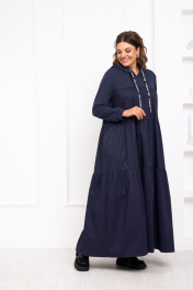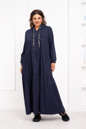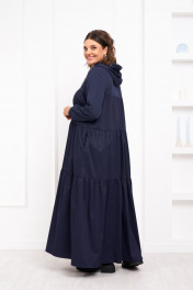 Молодежное платье свободного силуэта, выполнено из двух видов ткани, кокетки, рукава, капюшон - из трикотажа. По переду и спинке три оборки. Рукав втачной, длинный, заканчивается манжетой. Отделкой служат люверсы и шнур. Длина спинки - 142 см, длина рукава - 61см. 50 размер: ОГ -108 см. 52 размер: ОГ -112 см. 54 размер:ОГ -116 см.