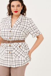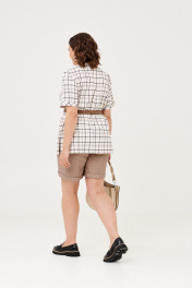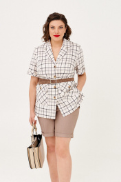 Простой, но стильный комплект состоитиз жакетабез подкладки и шорт. Жакет прямого силуэта, по боковым швам - разрезы. Воротник отложной, центральная застежка на петли и пуговицы. По переду накладные карманы с клапаном. Рукав втачной, короткий, с отложной манжетой по низу. Линию талии можно подчеркнуть ремнем. Шорты на притачном поясе по линии талии Талия регулируется за счет резинки. Застежка спереди на молнию.В боковых швах внутренние карманы. По низу шорт отложной манжет. В 50 размере: жакет ОГ 110см, ОТ 110 см, ОБ 115 см, длина 71 см; шорты ОТ 82-96см, ОБ 108см, длина 55 см. В 52 размере: жакет ОГ 114см, ОТ 114 см, ОБ 119 см, длина 71 см; шорты ОТ 86-100 см, ОБ 112см, длина 55 см. В 54 размере: жакет ОГ 118 см, ОТ 118 см, ОБ 123 см, длина 71 см; шорты ОТ 90-104 см, ОБ 116см, длина 55 см.