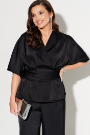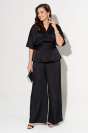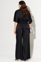 Костюм брючный, состоящий из блузки длиной 62 см и брюк длиной по боковому шву 110 см. Блузка на запах застегивается на потайные кнопки, талия на резинке по спинке, перед декорирован поясом. Рукав цельнокроенный длиной 44 см. Брюки прямого кроя, на резинке.