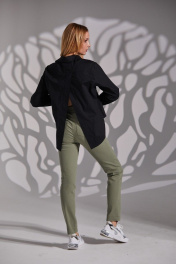 Рубашка женская оригинального кроя со спинкой назапах и втачным рукавом. Горловина обработана рубашечным воротником с отрезной стойкой. Застёжка центральная на петли-пуговицы. Низ рукава обработан притачным манжетом, застёгивается на петлю-пуговицу. Изделие с принтом ручной работы "птицы и дерево" по полочке.