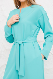 Комбинезон свободного силуэта со спущенным плечом и застежкой на потайную тесьму молнию с переди.Вырез горловины круглый. Рукав втачной длинный.В боковых швах действующие карманы.Пояс из основной ткани в комплекте.