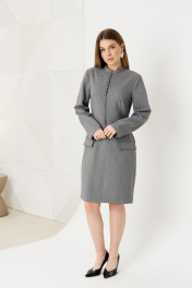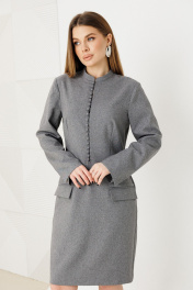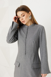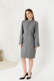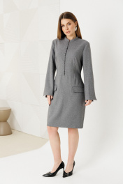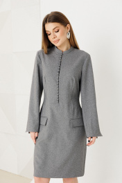 Платье женское приталенного силуэта,выполнено из костюмной ткани.По переду имитация застежки на петли-пуговицы,воротник стойка ,на рукавах шлицы,по спинке застежка на молнию.Изделие на подкладке.