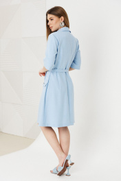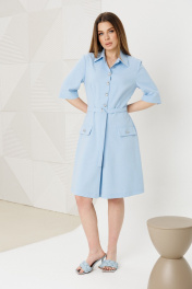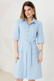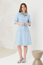 Платье-рубашка приталенного силуэта,выполнено из легкой костюмно-плательной ткани.По переду застежка на металлические пуговицы,по низу платья встреная складка(имитация шорт).Изделие без подкладки,пояс с пряжкой в комплекте.