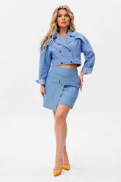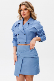 Костюм двухпредметный: состоящий из Жакета и Юбки. Жакет свободного силуэта,двухбортный со спущенным плечом.Перед и спинка на кокетках.По переду в кокетках декоративные клапаны.Рукав длинный на притачной манжете.. Юбка женская полуприлегающего силуэта..По переду юбки имитация запаха с декоративным хлястиком уходящим в боковой шов.Юбка по спинке со средним швом и талиевыми вытачками.В среднем шве застежка на потайную молнию.