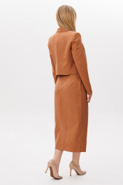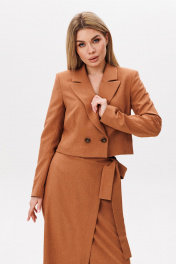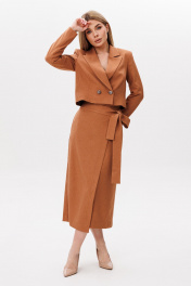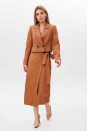 Костюм двухпредметный: состоящий из Жакета и Брюк.Жакет укороченный полуприлегающего силуэта. По переду нагрудная вытачка. Двухбортная застёжка на петли-пуговицы.Жакет на подкладке.Юбка свободного силуэта с имитацией запах с завязками. В среднем шве по спинке застежка на тесьму молнию.