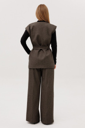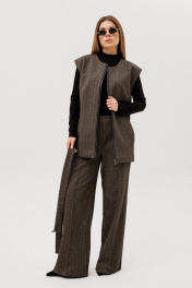 Костюм двухпредметный: Жилет женский свободного силуэта,с действующими карманами.По переду металлическая молния,пояс с пряжкой обтянутой из основной ткани.Элегантные женские брюки прямого кроя ,по переду на брючинах стрелки. Модель с высокой посадкой на притачном поясе обеспечивает идеальное прилегание. Спереди расположена практичная застежка на тесьму-молнию, добавляющая удобства при носке. Брюки укомплектованы функциональными боковыми карманами, что придает модели дополнительную практичность и удобство. Эта модель идеально подойдет как для офиса, так и для создания повседневных стильных образов.