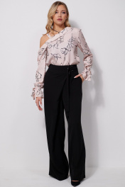 Блузка женская сводного кроя из нежнейшей вискозной ткани, с асимметрией по плечам идеально впишется в ваш гардероб. Правый рукав со спущенной линией без плечевого шва, левый втачной. Рукава длинные по низу в области запястья крепится пата которая завязывается в изящный бант или декоративный узел. Верхний срез блузки обрамляет воротник, по спущенному плечу обработан хлястик, который для удобства регулируется пряжкой. По низу изделия обработаны разрезы.