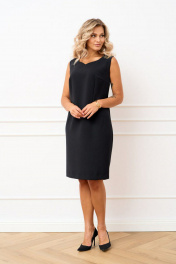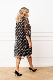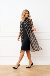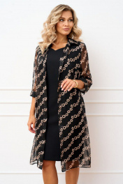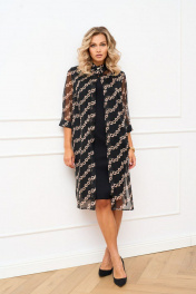 Комплект двух предметный состоящий из платья и накидки-рубашки. Платье полуприлегающего силуэта из плательно-костюмной ткани без рукавов, по полочке обработаны талиевые и нагрудные выточки, вырез горловины фигурный. Спинка со средним швом, в котором обработана застёжка на потайную тесьму молнию по низу обработан разрез, также обработаны талиевые выточки. Накидка-рубашка прямого силуэта выполнена из шифона. Воротник рубашечный, застёжка центральная на одну петлю и пуговицу по стойке. В боковых швах обработаны разрезы. Рукав втачной длинной ¾, по низу притачная манжета, застёгивающаяся на петлю и пуговицу.