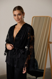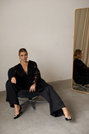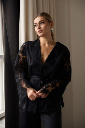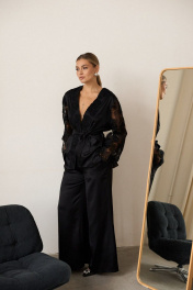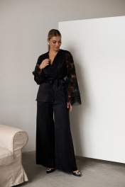 Костюм женский полуприлегающего силуэта из атласа и отделкой из кружевной ткани. Жакет полуприлегающего силуэта, застежка центральная обработана широкой приточной планкой из отделочной ткани. Рукав втачной, немного расклешённый к низу из отделочной кружевной ткани. Брюки прямого силуэта, слегка расклешённые к низу. В боковых швах обработан карман с отрезным бочком, верхний срез обработан притачным поясом с эластичной тесьмой что обеспечит идеальную посадку по фигуре. Костюм дополнен съёмным поясом из основной ткани