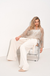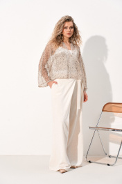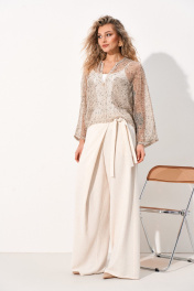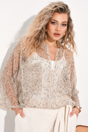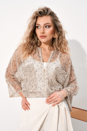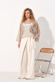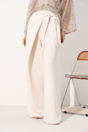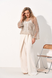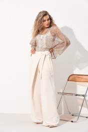 Комплект женский состоящий из бомбера и брюк. Брюки выполнены из смесового волокна льна и вискозы благодаря чему отлично садятся по фигуре и обеспечивают износостойкость. Крой брюк прямого с элегантным запахом по передним половинкам, в боковых швах обработан карман с отрезным бочком, в среднем шве застёжка на тесьму-молнию. Верхний срез обработан поясом кокеткой, застёгивающийся на потайные пуговицы и фиксирующийся завязками из ткани. Бомбер свободного силуэта с круглым вырезом горловины, центральной застёжкой на тесьму молнию. По полочке обработаны накладные карманы. Рукав цельнокроеный, длиной 7/8.