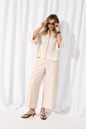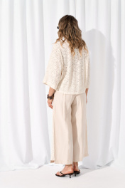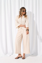 Костюм женский состоящий из бомбера и брюк. Брюки прямого силуэта выполнены из смесового волокна льна и вискозы благодаря чему отлично садятся по фигуре и обеспечивают износостойкость с отделкой в боковом шве из гипюра. В среднем шве обработана застежка на тесьму-молнию, верхний срез обработан притачным поясом с шлёвками для ремня, по спинке вставлена резинка что обеспечивает идеальную посадку на любую талию.