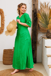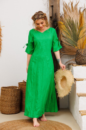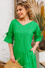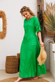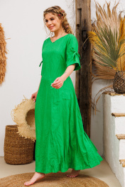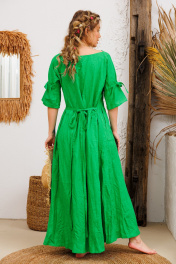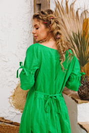 Очень эффектное льняное длинное платье с регулированием прилегания завязками по спинке. Элегантный V-образный вырез горловины, рукавчики имеют кулиску с завязочками что тоже позволяет регулировать обьем и образ. По спине на талии сборочка которая создает игривости и дополнительный шик юбке платья. Изделия бренда АМУЛЕТ создаются по славянским законам энергообережной одежды. Имеют перекидной крой и нет швов по главным энергоцентрам человека и они все пошиты закрытым способом по изнанке платья. Используется только натуральная ткань и фурнитура. В подарок платье упаковывается в шопер с символом бренда. Рост 164: ДИ 134 Рост 170: ДИ 140