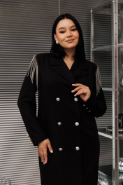Платье женское из текстильной ткани двубортное, полуприлегающего силуэта. По полочке и спинке прилегание создается за счет рельефов, выходящих из проймы. По спинке - средний шов, переходящий в шлицу. Вороник пиджачного типа. Застежка на петли и пуговицы. Рукав втачной двухшовный со шлицей и пуговицами. По окату рукова отделка в виде металлезированной бахромы. Длина по спинке: (50-54)-104 см, (56-58)-107см. Длина рукава: (50-54)-60см, (56-58) 62 см.