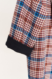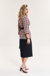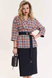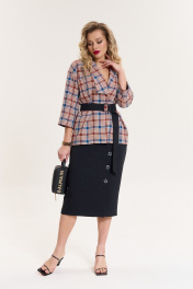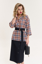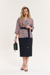 Комплект женский 2-предметный (жакет и юбка). Жакет из текстильной ткани в клетку прямого силуэта, со спущенным плечом. Воротник - ассиметричный: апаш и шалевый. Рукав 3/4 длины, с отложной манжетой из отделочной ткани. Застежка - на запах, фиксируется съемным поясом. Юбка однотонная (в мелкую клетку) зауженная к низу, по полочке по линии колена - складка, переходящая в шлицу. Отделка в виде пуговиц. По спинке: средний шов, молния, пояс отрезной с резинкой. Длина спинки (жакет)- (50-54)-68см, (56-60)-71см. Длина рукава: (50-54)-40 см, (56-60)-42см. Длина юбки 75см