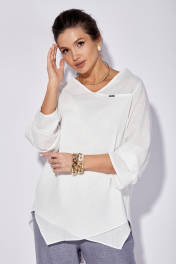 Комплект женский 2-хпредметный (блузка и брюки). Блузка женская из текстильной ткани. Модель прямого силуэта, рукав углублённый , рубашечного типа. Перед идет с запахом, низ блузы ассиметричный, по полочке углы, спинка закруглённая, удлинённая. По рукаву идут защипы.В качестве декора-логотип фирмы на горловине. Брюки из текстильной ткани, прямые, зауженные к низу за счет защипов. Пояс на резинке, по бокам карманы. Длина по спинке: 80см. Длина рукава: 47см. Длина брюк (48-52) -93см, (54-58)-95см