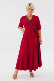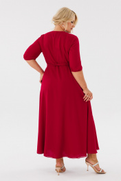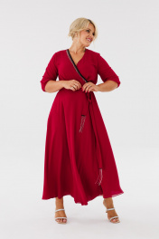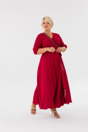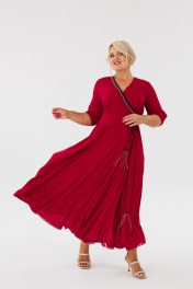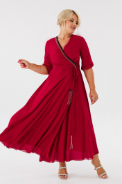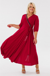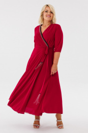 Элегантное женское платье из блузочной ткани отрезное по линии талии. Благодаря своему крою прекрасно будет смотреться на любой фигуре, скрывая недостатки. Спинка и полочка -двойные. Юбка-солнце-клеш (двойная). На лифе переда-нагрудные вытачки с проймы и по 2-е мягкие складки по талии. Спинка со средним швом и выточками. В правом боковом шве лифа - отверствие для пояса,который протягивается и завязывается по переду. Рукав втачной,одношовный, длиной 3/4. По низу рукава - мягкие складки. В качестве декора - металлизированная бахрома по горловине полочки и по краю пояса. Длина платья: верхняя часть: -(50-52)- 36см,(54-56)-37 см., юбка (50-56)-100см. Длина рукава: (50-56)-41 см.
