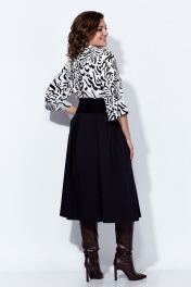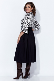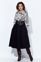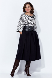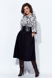 Элегантное женское платье из 2-х видов ткани: атласная ткань с трендовым анималистическим принтом и однотон. Шикарная альтернатива вечернему платью. Силуэт этого платья отлично подойдет любой женщине, даже с очень сложной фигурой. В нем вы везде будете неотразимы. Пояс корсетного типа красиво подчеркнет вашу талию. Платье отрезное по линии талии. По полочке объем груди создается за счет направленных складок из подреза. Объем юбки создается за счет центральной встречной и 2-х односторонних складок. По бокам в юбке- карманы. Рукав втачной, 3/4 длинны с отворотом. Вырез горловины лодочка с отложным воротником. Пояс в комплекте. Длина спинки до подреза -45 см., длина юбки -77см. Длина рукава-44 см.
