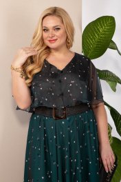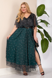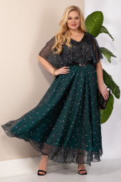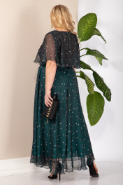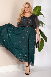 Платье женское из шифоновой ткани, отрезное по линии талии, на резинке. В верхней части платья идет отлетная кокетка по спинке и полочке в виде пелерины, по кокетке идет отделка в виде пуговиц, вырез V-образной формы. Полочка и спинка на подкладке. К платью идет съемный пояс.Юбка фасона "солнце", по полочке идет разрез по линии колена. Юбка на шифоновой подкладке с разрезом. Длина юбки:-100см. Длина кокетки (от горловины)-37см. Длина спинки:-45см.