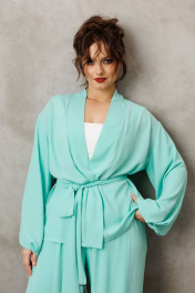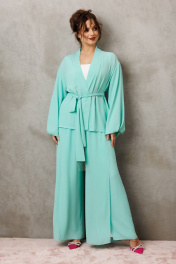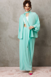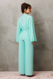 Элегантный вечерний костюм-двойка, состоящий из блузки свободного кроя и широких брюк. Красивый и эффектный брючный костюм - это идеальный образ для особых случаев, вечерних выходов, праздничных и торжественных мероприятий, будь то корпоратив, свадьба, юбилей, выпускной, день рождения, Новый год Блузка прямого силуэта со пущенной линией плеча. Рукав двойной, расширенный к низу со складками. По спинке и полочке идет планка. В комплекте с блузкой идет съемный пояс. На концах пояса металлизированная бахрома. Брюки прямые с запахом по переду, пояс на резинке.Благодаря фасону и крою, костюм визуально вытянет силуэт, сделает фигуру стройнее, подчеркнет ее достоинства, скроет недостатки. Элегантный брючный костюм от Anastasia- комфорт и уверенность в себе на любом мероприятии Длина блузки: (48-56)-61см. Длина рукава-52см. Длина брюк:(48-54)-105см., (56)-108см.