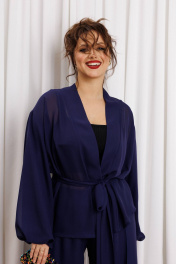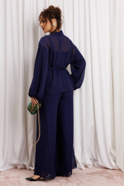 Элегантный вечерний костюм-двойка из шифона, состоящий из блузки свободного кроя и широких брюк. Красивый и эффектный брючный костюм - это идеальный образ для особых случаев, вечерних выходов, праздничных и торжественных мероприятий, будь то корпоратив, свадьба, юбилей, выпускной, день рождения, Новый год Блузка прямого силуэта из шифона со пущенной линией плеча. Рукав двойной, расширенный к низу со складками. По спинке и полочке идет планка. В комплекте с блузкой идет съемный пояс. На концах пояса металлизированная бахрома. Брюки прямые на трикотажной подкладке масло, с запахом по переду, пояс на резинке.Благодаря фасону и крою, костюм визуально вытянет силуэт, сделает фигуру стройнее, подчеркнет ее достоинства, скроет недостатки. Элегантный брючный костюм от Anastasia- комфорт и уверенность в себе на любом мероприятии Длина блузки: (48-56)-61см. Длина рукава-52см. Длина брюк:(48-54)-105см., (56)-108см.