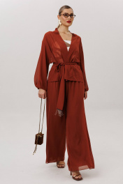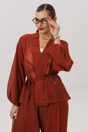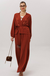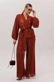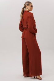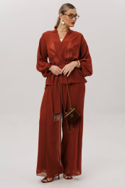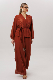 Элегантный вечерний костюм-двойка из шифона, состоящий из блузки свободного кроя и широких брюк. Красивый и эффектный брючный костюм - это идеальный образ для особых случаев, вечерних выходов, праздничных и торжественных мероприятий, будь то корпоратив, свадьба, юбилей, выпускной, день рождения, Новый год Блузка прямого силуэта из шифона со пущенной линией плеча. Рукав двойной, расширенный к низу со складками. По спинке и полочке идет планка. В комплекте с блузкой идет съемный пояс. На концах пояса металлизированная бахрома. Брюки прямые на трикотажной подкладке масло, с запахом по переду, пояс на резинке.Благодаря фасону и крою, костюм визуально вытянет силуэт, сделает фигуру стройнее, подчеркнет ее достоинства, скроет недостатки. Элегантный брючный костюм от Anastasia- комфорт и уверенность в себе на любом мероприятии Длина блузки: (48-56)-61см. Длина рукава-52см. Длина брюк:(48-54)-105см., (56)-108см.