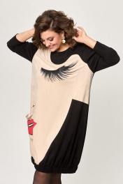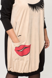 Платье прямого силуэта, выполнено из трикотажного однотонного полотна с эффектом “замша“ в двух контрастных цветах. Платье длиной до колена. Полочка платья с ассиметричными подрезами и принтом. На левой нижней части полочки настрочен накладной карман. Горловина круглой формы. Пройма углубленной формы, рукав длинный, одношовный. Низ платья обработан притачной планкой с эластичной тесьмой.